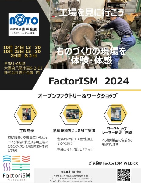 FactorISM(ファクトリズム) 2024 | 関西初オープンファクトリー(工場見学・ワークショップ)イベント │ 八尾市・東大阪市・堺市・門真市 - 「FactorISM(ファクトリズム)」は、八尾市・堺市・門真市・東大阪市を中心に、町工場でのものづくりの現場を体験・体感してもらうイベントです。イベント中は各地域のまちこうばが一般の方向けの工場見学やワークショップを開催。イベント会場やキッチンカーの出展など、ものづくりの見学・体験を中心に1日楽しめるイベントです。